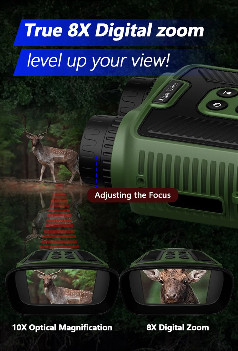 - Zoom Óptico 10x y Digital 8x: Aumenta los detalles de los objetos observados con gran claridad.