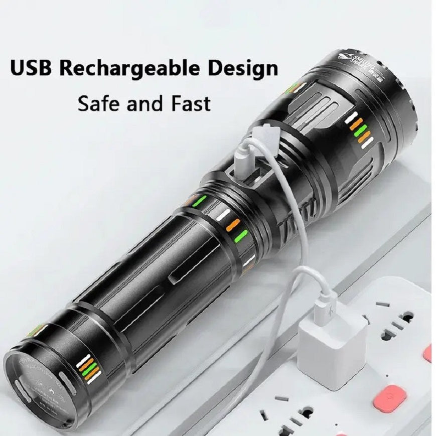 En resumen, la linterna de aluminio aeroespacial "Super Bright Zoom LED Flashlight" es una herramienta de iluminación de alto rendimiento con la ventaja adicional de funcionar como powerbank. Con su diseño resistente, múltiples modos de iluminación y capacidad de carga de dispositivos electrónicos, esta linterna es perfecta para cualquier aventura al aire libre o situación en la que necesites una fuente confiable de luz y energía.