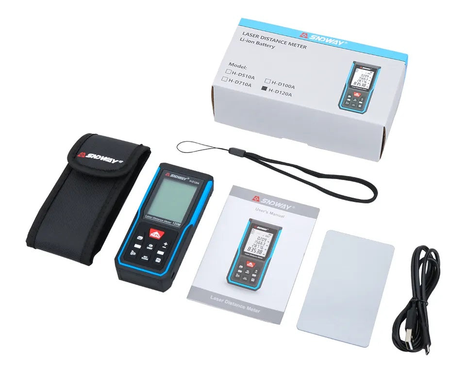 El medidor láser SNDWAY H-D120 también cuenta con múltiples funciones de medición, como medición continua, medición de área y volumen, y medición de Pitágoras en modo completo. Puedes cambiar fácilmente entre las unidades de medida (metros, pulgadas o pies) y utilizar la función de suma y resta para calcular distancias y áreas complejas.
