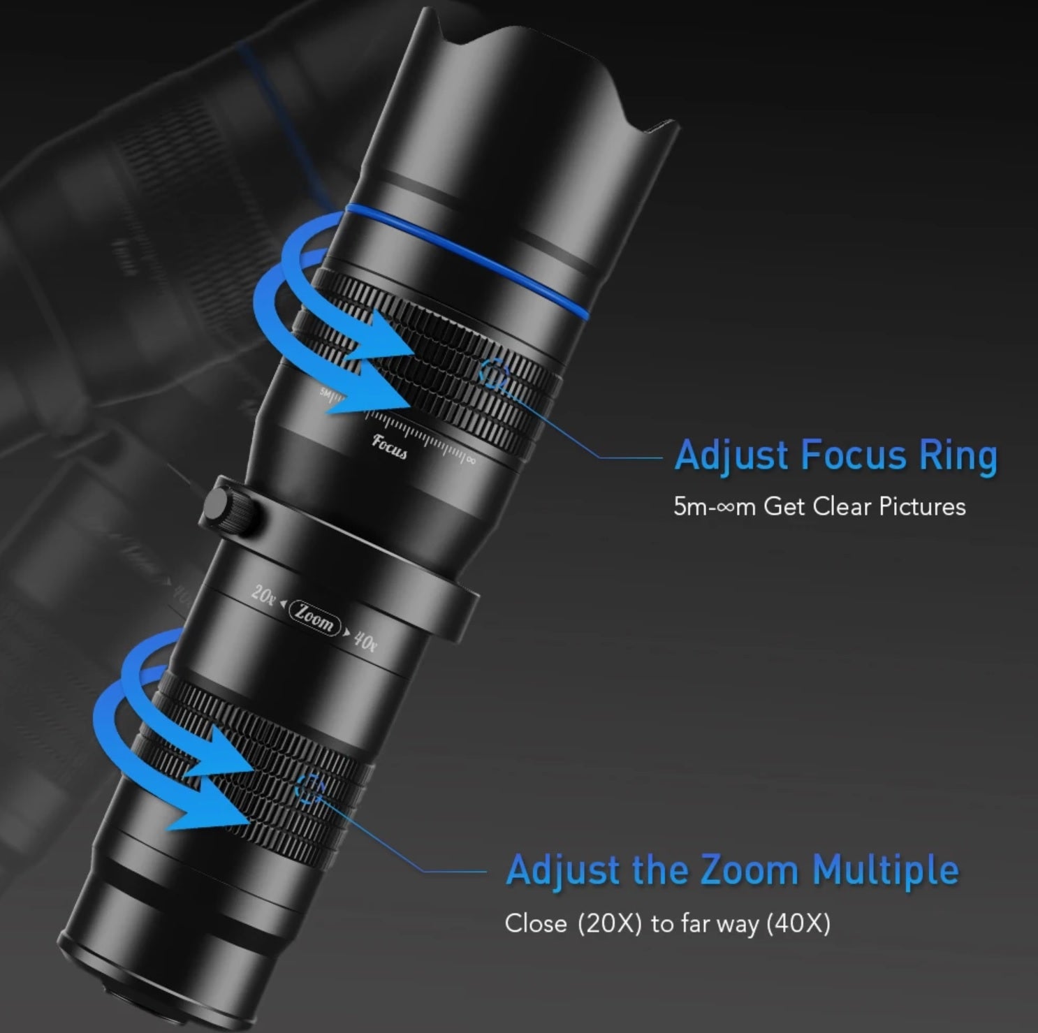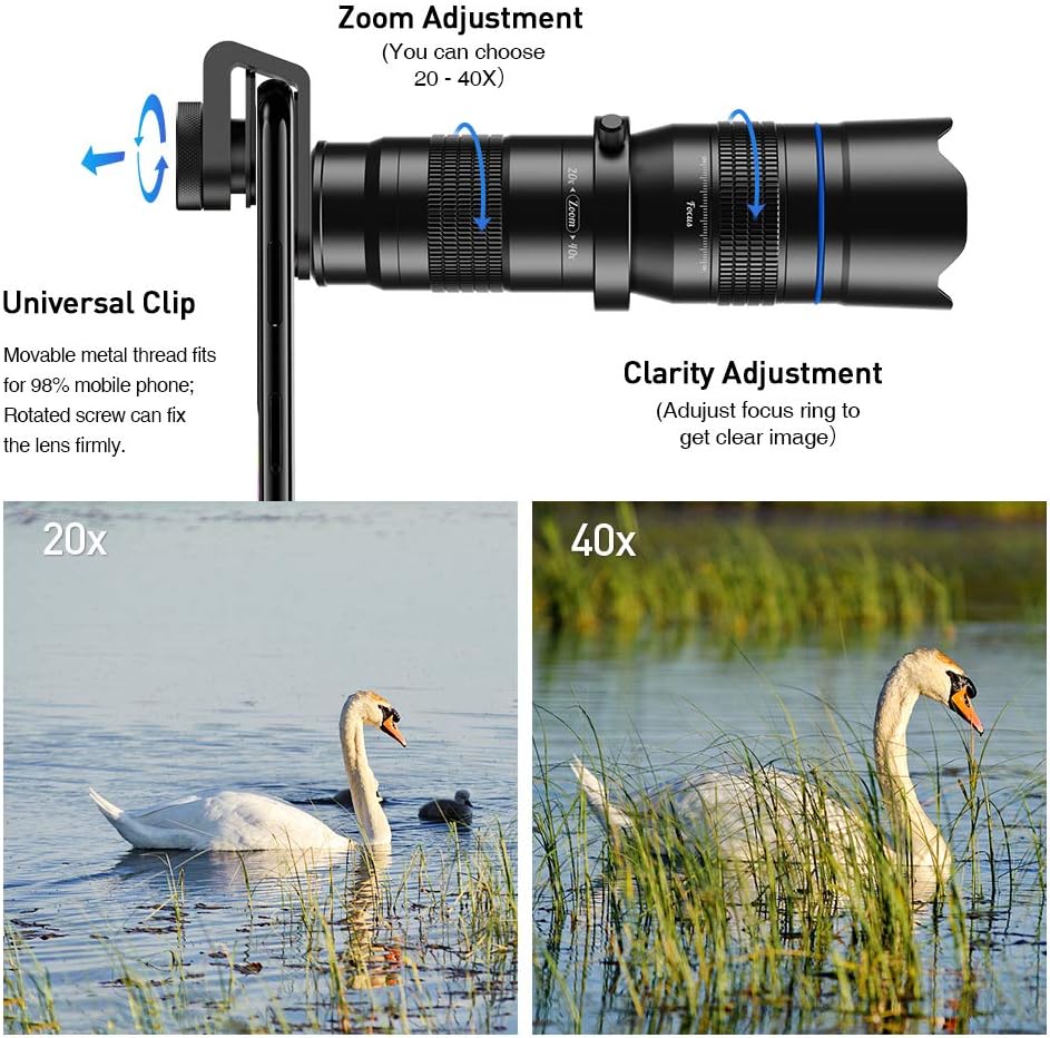 El telescopio APEXEL APL-20-40XJJ04 está diseñado para transformar la cámara de tu smartphone en una herramienta de fotografía de largo alcance. Su lente zoom ajustable de 20x a 40x permite capturar imágenes nítidas a grandes distancias, ideal para observación de aves, paisajes, conciertos, viajes, camping y más.